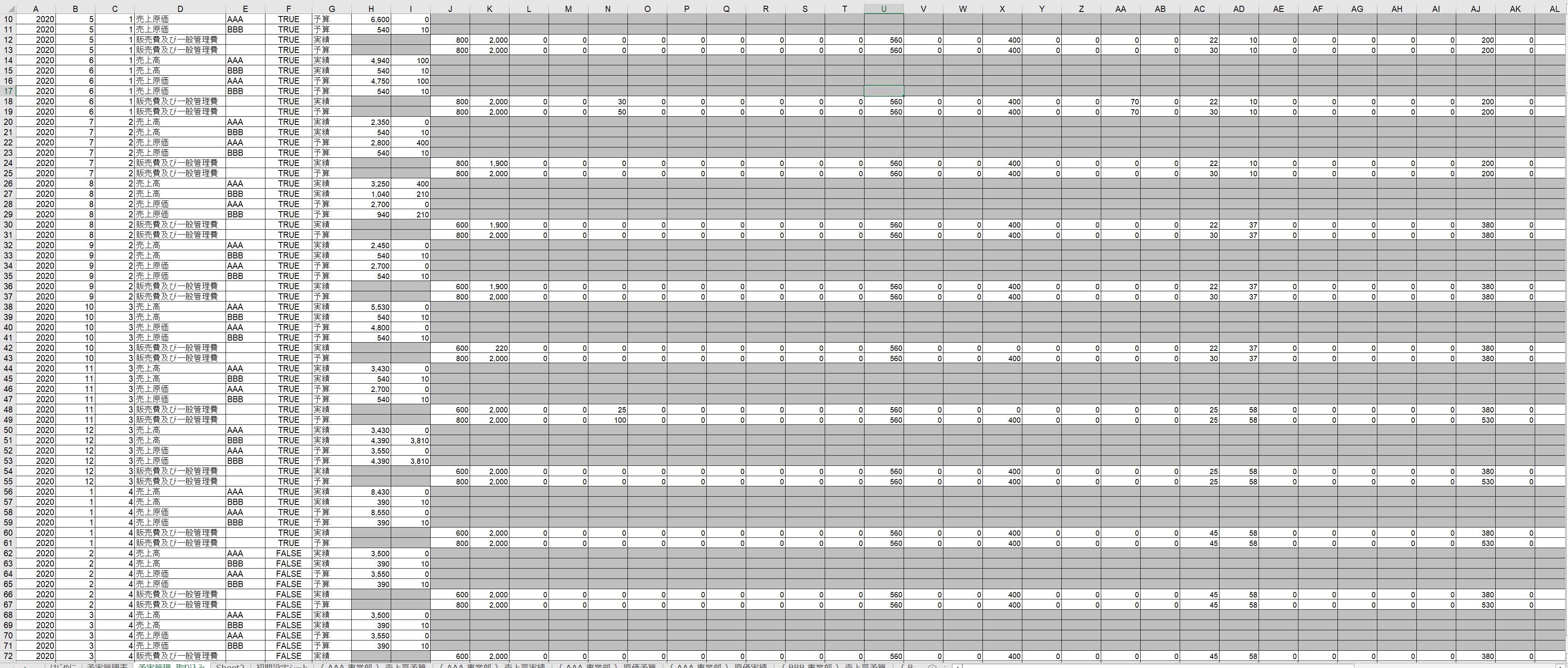 では実例として予実管理のデータを見てみましょう。(スプレッドシートです)