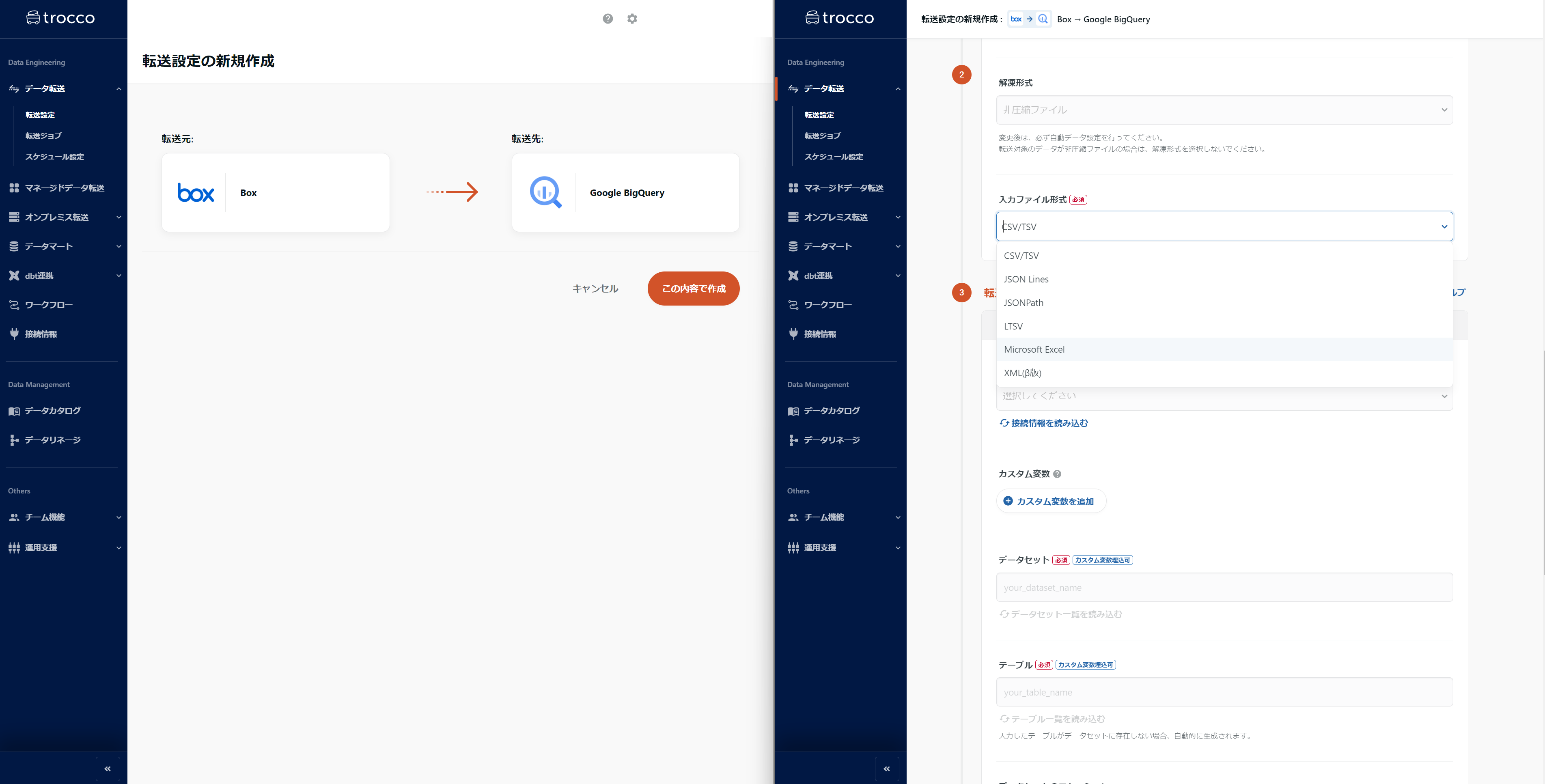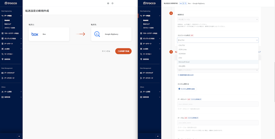 その後、TROCCOを用いてデータの転送設定を作るだけです。こちらは本当に楽な作業です。