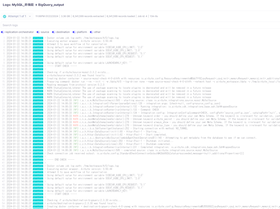 Airbyte | 13:08 | MySQL側にあり得ない日付が入っていたのでオミットし、再実行 |