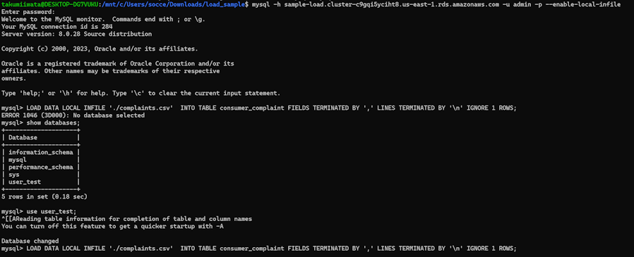 mysql -h sample-load.cluster-c9gqi5yciht8.us-east-1.rds.amazonaws.com -u admin -p --enable-local-infile