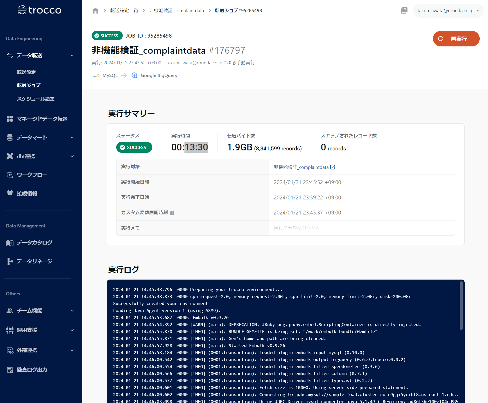 TROCCO | 13:30 | 何事もなく一発で転送完了 |