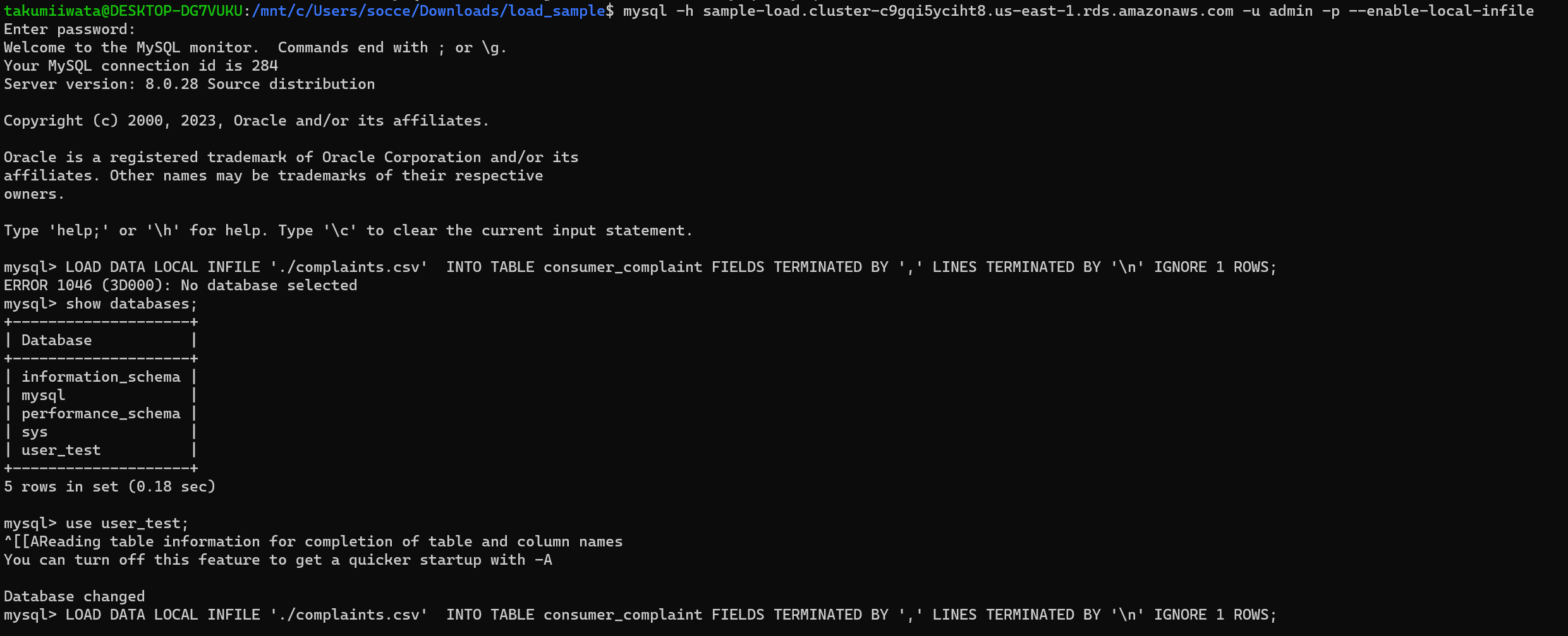 mysql -h sample-load.cluster-c9gqi5yciht8.us-east-1.rds.amazonaws.com -u admin -p --enable-local-infile